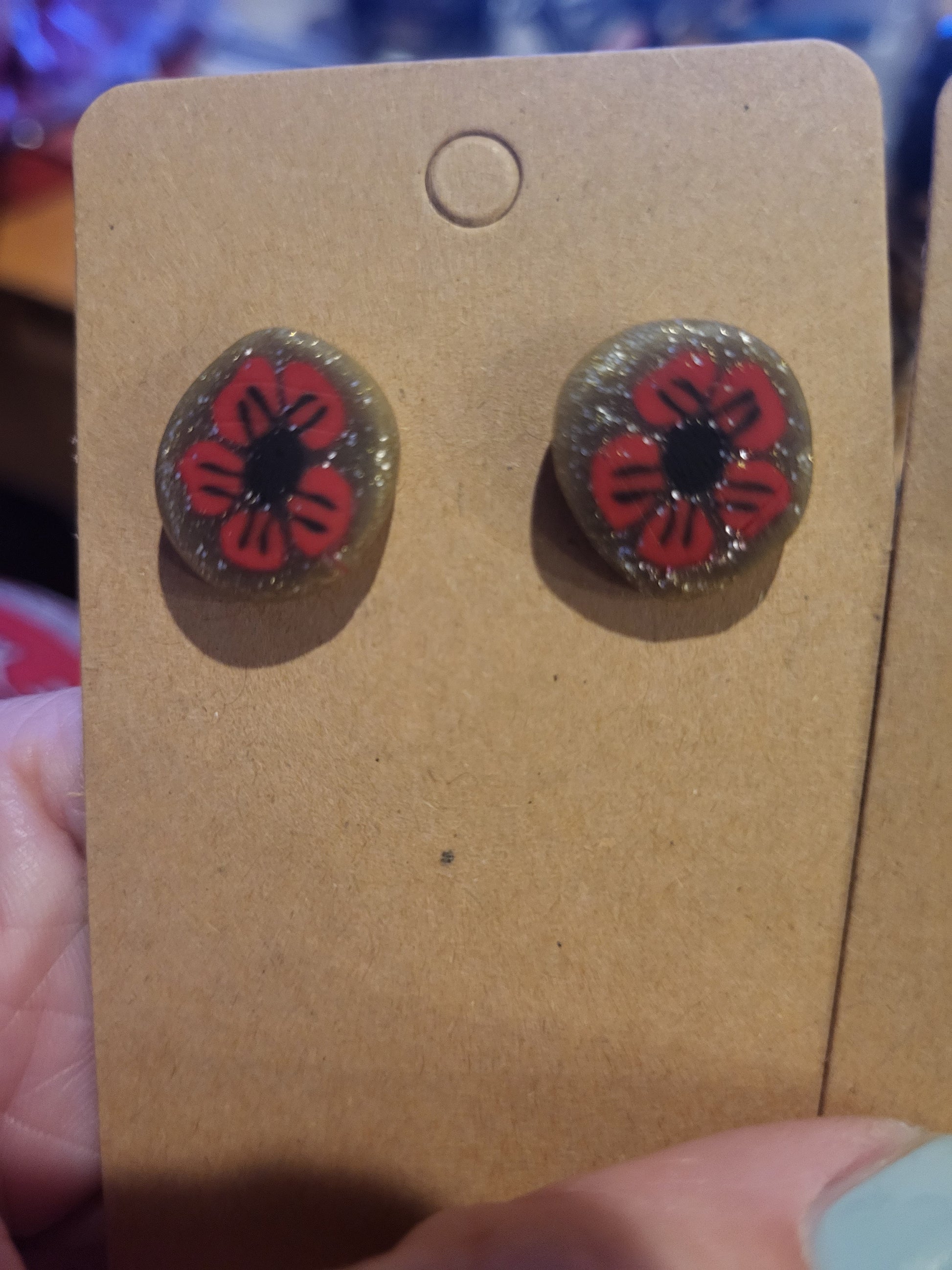 Red and black flower with silver glitter in the outside earrings. Clay caning!