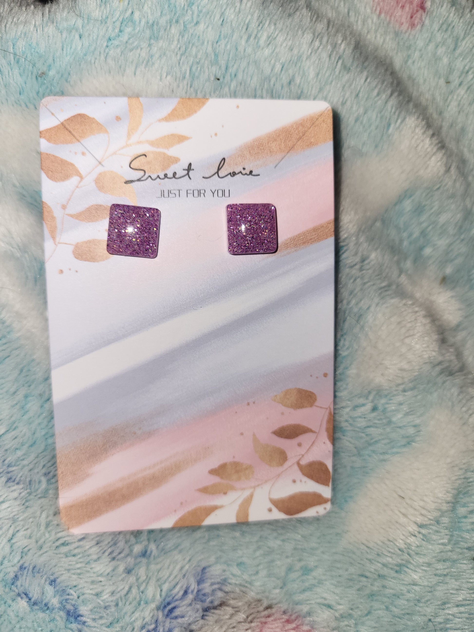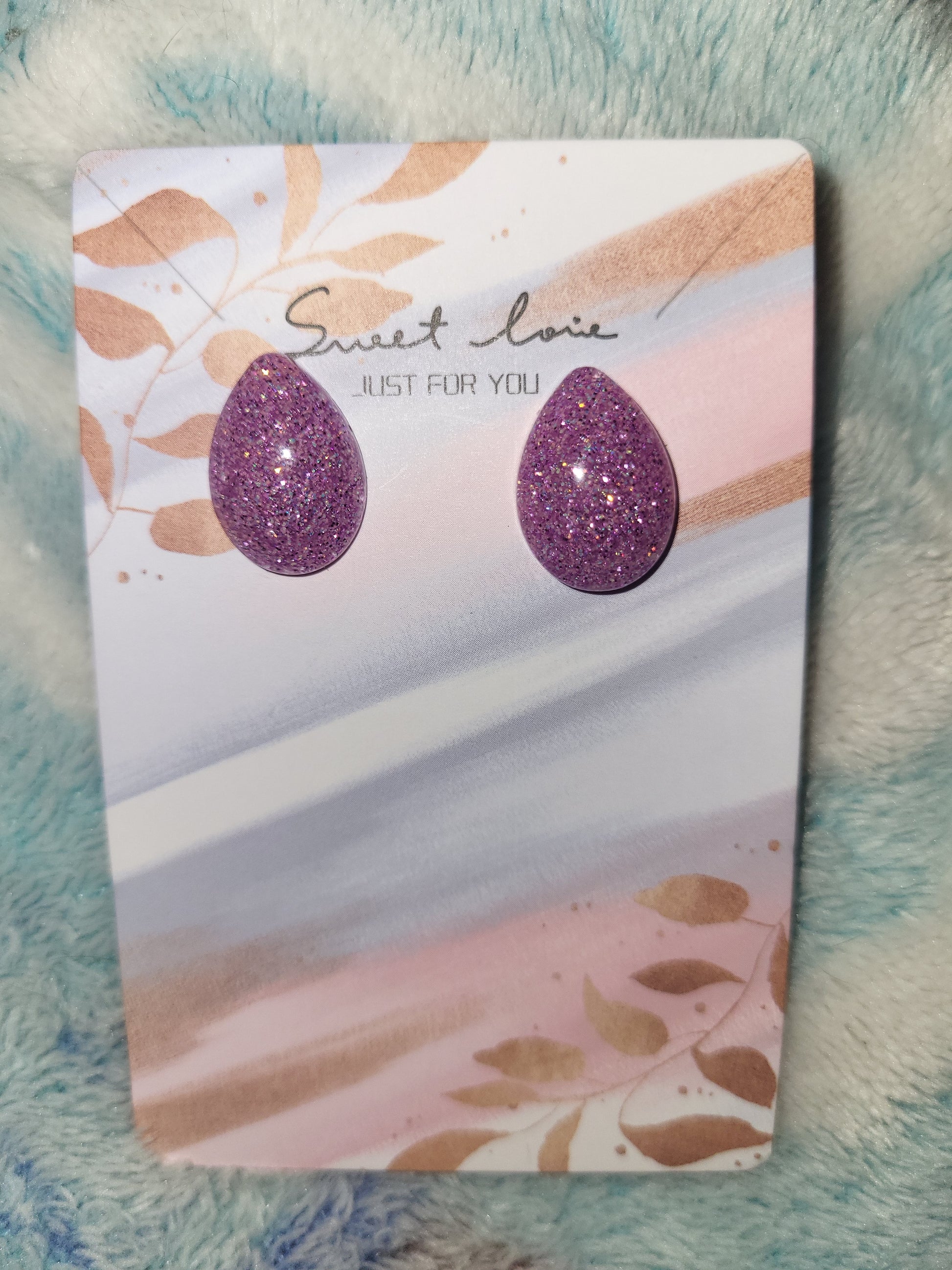 A variety of different sizes of purple/pink glitter earrings homemade from uv resin